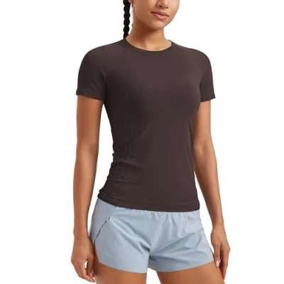 CRZ YOGA Women's Seamless Sports T Shirts Breathable Short Sleeve Top Active Gym Running Fitness Shirt Hot Fudge Brown 12