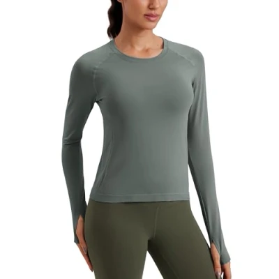 CRZ YOGA Women's Sports Long Sleeve Shirts Ribbed Running Shirt with Thumb Hole Breathable Quick Dry Fitness Tops Grey Sage 10