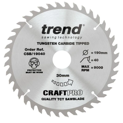 General description The Trend CSB/19040 TCT Craft Saw Blade is designed for a professional finish in various materials including soft wood, hard wood, plywood, soft fibre, plasterboard, stone, fibre board, cement bonded board, and particle board. This blade features a high-grade alloy steel plate body that is precision ground to maintain flatness and is tipped with microgranular Tungsten Carbide for cutting abrasive materials. Technical specifications Diameter: 190 mm (7 1/2 inch) Bore: 30 mm Kerf: 2.6 mm Plate thickness: 1.7 mm Number of teeth: 40 Tooth form: ATB Quick Selector No.: 15 Compatibility and accessories Includes 1 x 30-16mm bushing washer Includes 1 x 30-20mm bushing washer Other information Reamed bore ensures precise fit to spindle Silverbraze technology securely bonds the tip to the body Body is hardened and tempered to maintain trueness Laser etched on reverse to European standard EN847-1/2 Trend name provides traceability and a guarantee of quality
