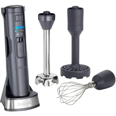 Cordless convenience: Say hello to your powerful and portable kitchen buddy, designed to tackle any kitchen task with ease without the restriction of plugging into a socket Long-lasting battery for complete flexibility: Cutting-edge lithium-ion battery conveniently charged via USB in just 2 hours, for 30 minutes of continuous use-ample time to blend big batches of soup Versatile Attachments: Comes with three essential, easy-to-store accessories for blending/mixing, whisking, and mashing, making it perfect for a variety of kitchen tasks Powerful Performance: With five speed settings and an ultra-sharp blade, you have complete control over the consistency of your recipes, from puréeing smoothies to mixing dips and dressings Heat-Resistant Blending Arm: The extra-long stainless steel blending attachment can handle hot recipes up to 100°C, making it ideal for puréeing hot soups and baby food directly in the pot Easy to use and clean: Simple 'click on & off' attachments, battery recharge indicator lights and dishwasher safe attachments. Plus, 3year guarantee promises seamless prepping for years to come, Weight: 4.6958461806 pounds, Manufacturer: Cuisinart