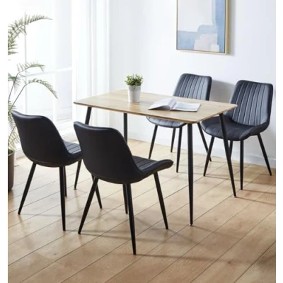 PREMIUM QUALITY CONSTRUCTION | Crafted from a premium MDF top rectangle dining table, and 4 dining chairs, both supported by metal legs, this set offers a long-lasting build. Dimensions: 70D x 120W x 75Hcm for table, and 60D x 52W x 84Hcm for chairs. SLEEK & MODERN DESIGN | This brown oak effect top 4 seater dining table and chairs with ergonomic design, in black bonded leather upholstery. With matching powder-coated black metal legs, this stylish set offers a sleek industrial vibe for modern setup. VERSATILE FUNCTIONALITY | Designed for small spaces, this kitchen table and chairs set 4 is ideal for breakfast corners, apartments, offices, or cafes. Its multifunctional use makes it suitable for casual dining, or even cosy client meetings. SUPERIOR QUALITY COMMITMENT | Backed by a one-year quality guarantee, this small dining table and chairs set 4 reflects Hallowood Furniture’s dedication to quality. Every piece is made to meet the highest standards for safety and durability. ASSEMBLY MADE EASY | This small dining table and 4 chairs comes with high-quality easy to assemble metal legs. All packages include instructions manuals. A stylish, low-maintenance choice of dining room sets for any modern space.
