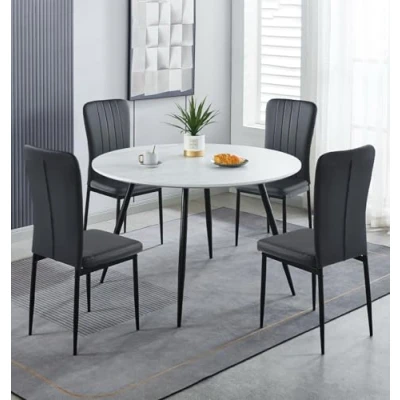 PREMIUM QUALITY CONSTRUCTION | Crafted with a marble effect top and strong metal legs, this faux marble white round table at H75 x W120 x D120cm, is set with 4 chairs in 96H x 42W x 56Dcm. These dining set for 4 are built for durability and comfort. SLEEK & MODERN DESIGN | Featuring a contemporary round design, this marble effect tabletop kitchen table and chairs set 4 cushioned in faux black leather has matching powder-coated black metal legs that offers a sleek industrial vibe for modern setup. VERSATILE FUNCTIONALITY | This round dining table with chairs adapts easily to any space, from kitchens to work areas. The kitchen table and chairs set 4 combine style and function for versatile everyday living. SUPERIOR QUALITY COMMITMENT | Backed by a one-year quality guarantee, this large round dining table and chairs set 4 reflects Hallowood Furniture’s dedication to quality. Every piece is made to meet the highest standards for safety and durability. ASSEMBLY MADE EASY | This round marble dining table and 4 chairs comes with high-quality easy to assemble metal legs. All packages include instructions manuals. A stylish, low-maintenance choice for any modern space.