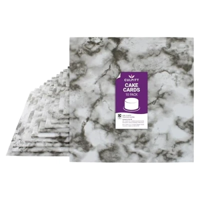 CAKE CARDS – Pack of 10 Marble effect cake cards that are ideal for sponge celebration cakes and for using between the individual layers in a stacked cake. The marble effect printed finish is perfect for anniversaries, weddings, birthdays, and New Year. 3MM THIN - This double thick card is the ideal option for anyone looking for a good quality Cake Card which is great value for money. Stronger than standard cake cards these are designed for cakes, cupcakes, or treats, and not for supporting heavy fruit cakes. MARBLE EFFECT – Each cake square has a modern Marble effect printed foil finish on the top and sides with a white base. Grease resistant. PACK OF TEN – These 10 Inch cake boards come as a pack of 10 and are shrink wrapped together for maximum cleanliness. Available in a range of different finishes and colours including Rose Gold, Black, and Marble. MADE IN THE UK – These hand finished cake cards are made in the UK so you’re supporting British business when choosing this cake board., Weight: 1.8298367746 Pounds, Manufacturer: Culpitt