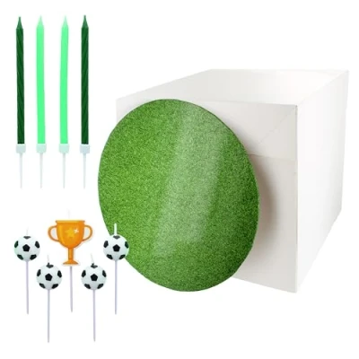 FOOTBALL CAKE SET - Celebrate that special birthday in style with this ready to use Football Cake Set. Perfect for birthday's this pack contains 1 x grass effect cake board, 9 x football birthday cake candles, and 1 x tall cake box. TALL WHITE CAKE BOX – The cake box with lid is perfect for keeping your freshly baked cakes free from damage. The box is plain white, windowless and 10 inches high so ideal for all stacked cakes or if you need to decorate the cake with toppers and candles before transporting it to the special event. EXTRA STRONG CAKE BOARD – Masonite cake boards are incredibly strong for their 4mm thickness and are a great choice for all types of cakes from lighter sponges to dense fruit cakes and is the best cake board to support heavier cakes and multi-tier cakes. This masonite cake board features a printed grass effect design to give cakes a stylish finish that is perfect for displaying all kinds of sports or dinosaur cakes. FOOTBALL CANDLES - Celebrate that special birthday in style with these Football birthday cake candles. 9 piece football party set includes 4 footballs, 4 tall green spiral candles, and a gold cup. Each with food-safe pics for placing directly on top of the cake. READY TO USE CAKE DECORATION KIT - Use these football candles for cake to instantly add height and interest to any home made or store bought cake. Pair with other football themed party decorations, football table decorations, or edible football cake decorations and toppers., Weight: 0.9038952742 Pounds, Manufacturer: Culpitt