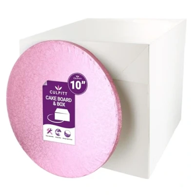 CAKE BOARD & BOX - This tall white box and Light Pink round cake board set is the perfect way to efficiently and safely transport your special homemade cakes for birthdays, celebrations and parties. Pack contains 1 cake board and 1 tall cake box. TALL CAKE BOX – The extra tall cake box with lid is perfect for decorated birthday cakes or tiered celebration cakes, and will keep all your freshly baked cakes free from damage. The box is plain white, windowless and 10 inches high. A great way to transport your cakes to birthday parties, bake sales, family events, and more. PINK CAKE BOARD – The round 10 inch cake board, also known as a cake drum, is perfect for a 7 fruit cake or a 8 sponge cake. A great choice for wedding anniversaries, princess birthday cakes, and Valentines day. STURDY – A cake drum is a great choice for all types of cakes from Birthday cake sponge cakes to dense fruit cakes and is the best cake board to support heavier cakes and multi-tier cakes. EASY TO ASSEMBLE - The plain white cake box is delivered flat but is very easy to assemble meaning you will be ready to transport your cake in seconds. Shrink wrapped for hygiene., Weight: 0.7495716908 Pounds, Manufacturer: Culpitt