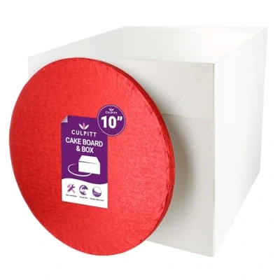 CAKE BOARD & BOX - This tall white box and Red round cake board set is the perfect way to efficiently and safely transport your special homemade cakes for birthdays, celebrations and parties. Pack contains 1 cake board and 1 tall cake box. TALL CAKE BOX – The extra tall cake box with lid is perfect for decorated birthday cakes or tiered celebration cakes, and will keep all your freshly baked cakes free from damage. The box is plain white, windowless and 10 inches high. A great way to transport your cakes to birthday parties, bake sales, family events, and more. RED CAKE BOARD – The round 10 inch cake board, also known as a cake drum, is perfect for a 7 fruit cake or a 8 sponge cake. STURDY – A cake drum is a great choice for all types of cakes from Birthday cake sponge cakes to dense fruit cakes and is the best cake board to support heavier cakes and multi-tier cakes. EASY TO ASSEMBLE - The plain white cake box is delivered flat but is very easy to assemble meaning you will be ready to transport your cake in seconds. Shrink wrapped for hygiene., Weight: 0.7495716908 pounds, Manufacturer: Culpitt