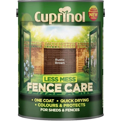 General description Cuprinol Less Mess Fence Care in Rustic Brown is designed for easy application, providing both color and protection for sheds, fences, and other rough sawn garden wood. Its unique formulation allows for a rich color and even coverage with just one coat. Technical specifications Available size: 5L Covers up to 24m² with 1 coat or 8 fence panels Quick drying Special pigments for rich color Other information Coverage may vary depending on application method and the condition of the surface.