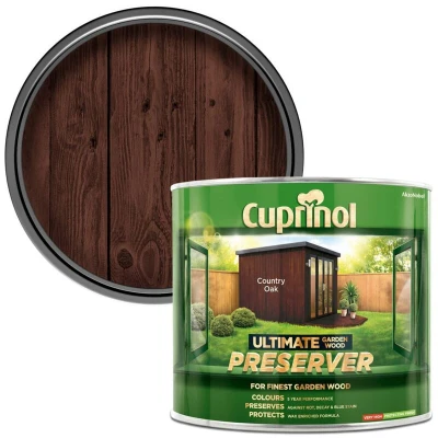 General description Cuprinol Ultimate Garden Wood Preserver is a superior, water-based formulation designed to protect and enhance the beauty of your outdoor wood. It works in three effective ways: UV filters provide long-lasting color for up to 5 years, added waxes and resins offer advanced weather protection, and active ingredients penetrate deep into the wood to guard against rot, decay, and blue stain. Technical specifications Colour: Country Oak Size: 1 litre Drying Time: 2-6 hours Coverage: 4L covers up to 20m² on smooth planed wood and 12-16m² on rough sawn wood in 2 coats Coverage may vary depending on the condition and nature of the surface Compatibility and accessories Can be used on all types of rough or planed wood such as sheds, fences, summer houses, gates, and arbours.