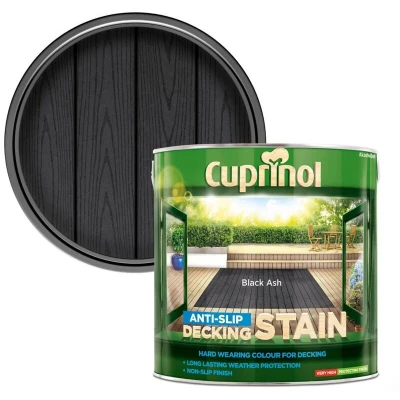 General description Cuprinol Anti-Slip Decking Stain in Black Ash is a high-quality, water-based stain designed for all types of timber decking. It features a rich semi-transparent color and a tough, durable finish that enhances the beauty of your outdoor spaces while providing safety with its unique anti-slip formulation. Technical specifications Color: Black Ash Size: 2.5 litre Coverage: Up to 20m² with 2 coats on bare or previously stained wood Drying Time: 2-6 hours depending on surface nature and weather conditions Number of Coats: 2-3 coats recommended Usage Cuprinol Anti-Slip Decking Stain is suitable for use on various types of garden wood and is safe for plants and pets once dry. It is designed to provide long-lasting weather protection and a semi-transparent matt finish, making it ideal for enhancing the appearance of your decking while ensuring safety. Other information This product contains invisible anti-slip microbeads for added safety and an algicide to protect against