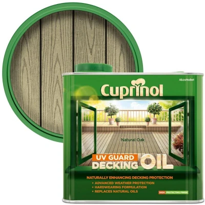General description Cuprinol UV Guard Decking Oil in Natural Oak is designed to nourish and protect your wooden surfaces. This oil can be applied by brush or spray, effectively penetrating the wood to replace natural oils and resins lost due to weathering. Its lightly tinted formula revitalizes the color of weathered wood, enhancing its appearance while providing essential protection against the elements. Technical specifications Colour: Natural Oak Size: 2.5 litres Coverage: Up to 20m² with 2 coats when brushed applied, or 8m² per litre with 2 coats when spray applied Drying time: Up to 6 hours, depending on surface nature and weather conditions Number of coats recommended: 2