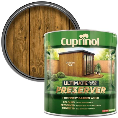 General description Cuprinol Ultimate Garden Wood Preserver is a superior, water-based formulation designed to protect and enhance the beauty of your outdoor wood surfaces. It works in three ways: UV filters provide long-lasting color for up to 5 years, added waxes and resins offer advanced weather protection, and active ingredients penetrate deep into the wood to guard against rot, decay, and blue stain. Technical specifications Colour: Golden Oak Size: 4 litres Coverage: 4L covers up to 20m² on smooth planed wood and 12-16m² on rough sawn wood in 2 coats Drying Time: 2-6 hours Compatibility and accessories Suitable for all types of rough or planed wood including sheds, fences, summer houses, gates, and arbours