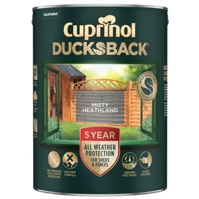 General description Cuprinol 5 Year Ducksback is a high-performance, wax-enriched paint designed specifically for sheds and fences. This advanced formulation provides long-lasting color and weather protection for up to 5 years. It is available in 9 colors, including Misty Heathland, and is ideal for restoring and enhancing the appearance of rough sawn garden wood. Technical specifications Volume: 5 litres Coverage: Up to 24 m² or 8 fence panels (1 coat) Showerproof in 1 hour Usage Cuprinol Ducksback is quick drying, low odour, and safe to use around plants and pets. Its non-drip formulation minimizes mess during application, making it easy to apply. However, it is not suitable for use on smooth planed wood, decking, or garden furniture.