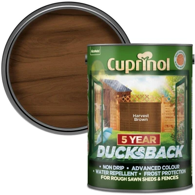 General description Cuprinol Ducksback 5 Year Waterproof for Sheds & Fences in Harvest Brown is an advanced, wax-enriched formulation designed to color and weather protect rough sawn garden wood for up to 5 years. This product is ideal for restoring and enhancing the appearance of sheds and fences, ensuring they remain visually appealing for years to come. Technical specifications Colour: Harvest Brown Size: 5 litres Coverage: Up to 24 square metres with one coat Coverage equivalent: Approximately 8 fence panels (1 coat) Usage Cuprinol Ducksback is quick drying, low odour, and safe to use around plants and pets. Its non-drip formulation minimizes mess during application, and it becomes showerproof in just 1 hour. Coverage may vary depending on the application method and the condition of the surface.
