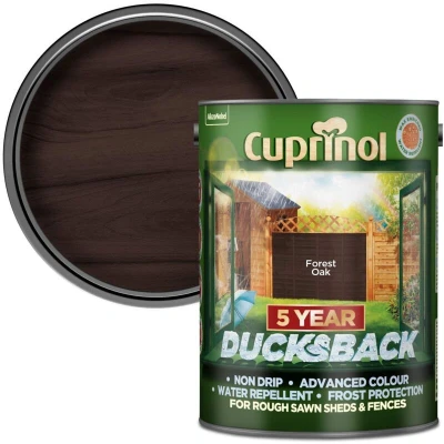 General description Cuprinol Ducksback 5 Year Waterproof for Sheds & Fences in Forest Oak is an advanced, wax-enriched formulation designed to color and weather protect rough sawn garden wood for up to 5 years. This product is ideal for restoring and enhancing the appearance of sheds and fences, ensuring they remain visually appealing for years to come. Technical specifications Colour: Forest Oak Size: 5 litres Coverage: Up to 24 square metres with one coat Coverage can vary depending on application method and the condition and nature of the surface Usage Cuprinol Ducksback is quick drying, low odour, and safe to use around plants and pets. Its non-drip formulation minimizes mess during application, making it easy to work with. Other information Showerproof in 1 hour Available in 9 colours