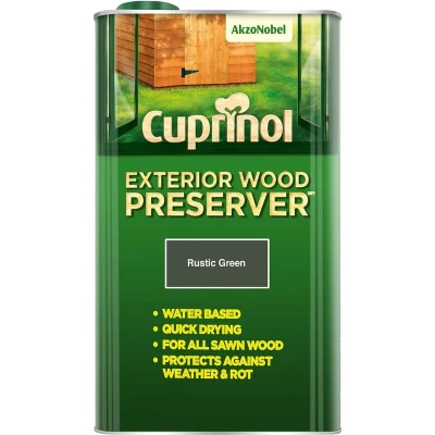 General description Cuprinol Exterior Wood Preserver is a wood treatment designed for use on sheds, fences, and any roughly sawn timbers. It provides protection against weather conditions and helps to prevent rot. Technical specifications Volume: 5L Water Based Coverage: Up to 10 sq/m per litre (coverage may vary depending on the condition and nature of the surface) Available in 5 colours