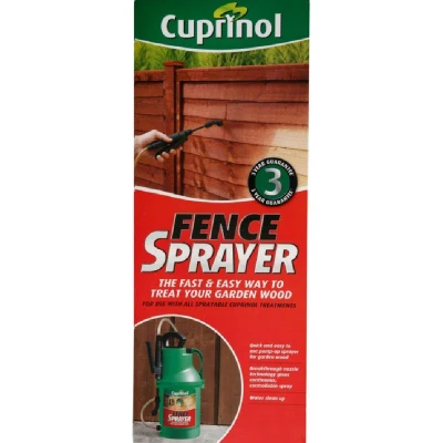 General description Quick and easy to use, the Cuprinol Fence Sprayer is designed for treating garden wood efficiently. It features breakthrough nozzle technology that provides a continuous and controllable spray, making it the fast and easy way to color and protect your outdoor wood surfaces. This product comes with a 3-year guarantee. Usage With the Cuprinol Fence Sprayer and compatible sprayable Cuprinol treatments, you can treat your garden wood in a fraction of the time compared to traditional brush methods. Coverage is quoted with two coats, and it may vary depending on the application method and the condition of the surface. Other information For specific coverage details, refer to the back of the pack of the relevant Cuprinol sprayable product.