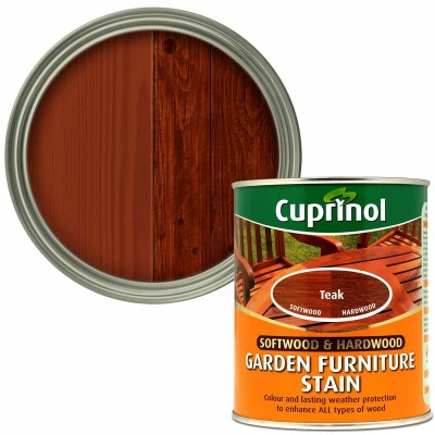 General description The Cuprinol Softwood & Hardwood Garden Furniture Stain in Teak is designed to enhance the appearance of both new and old wood. This stain creates a lasting water-repellent barrier and provides weather protection, making it suitable for all types of wood, including both hardwood and softwood. It adds a rich color to softwood and a light tint to hardwood, ensuring durability and a long-lasting finish. Technical specifications Color: Teak Size: 750ml Type: Stain Coverage: Approx. 15m² per 750ml for 1 coat Compatibility and accessories Compatible with various types of garden furniture made from softwood or hardwood Recommended tools: Brush for application Installation Apply with a brush evenly over clean, dry wood Typically requires 2-3 coats for optimal coverage Clean brushes with water after use Usage Allow 2-6 hours to dry between coats Ensure the surface is clean and free of dust or old paint before application Apply in a well-ventilated area Other information