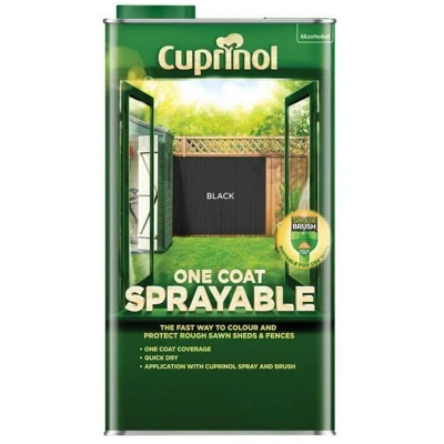 General description This Cuprinol One Coat Sprayable Fence Treatment in Black is specially formulated for use with Cuprinol Sprayers, allowing you to color and protect rough sawn timber quickly and efficiently. It is designed to provide a rich color and even coverage in just one coat, making it the fastest and easiest solution for treating fences. Technical specifications Colour: Black Size: 5 litre Coverage: Up to 15m² with one coat or 5 fence panel sides (6 x 5 feet) Quick-drying Low odour Usage Apply with Cuprinol sprayers or a brush Coverage may vary depending on application method and the condition of the surface