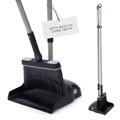 NO-BEND LONG HANDLED DESIGN: Long handled dustpan and brush set designed to reduce bending and strain while sweeping. Ideal for everyday clean-ups around kitchens, living spaces, patios, garages, and utility areas. SOFT BRISTLES FOR EFFECTIVE SWEEPING: Soft yet durable bristles collect fine dust, crumbs, pet hair, and light debris with smooth sweeping action across hard floors, tiles, laminate, decking, and other surfaces. BUILT-IN COMB TEETH FOR EASY MAINTENANCE: Integrated comb teeth on the dustpan help remove tangled hair and debris from the brush bristles, keeping hands clean and maintaining consistent sweeping performance. STANDING PAN & BRUSH WITH SPACE-SAVING STORAGE: Brush clips securely into the dustpan handle for upright, compact storage, helping keep kitchens, cupboards, utility rooms, and sheds neat and clutter-free. STRONG & PRACTICAL FOR EVERYDAY USE: Sturdy handle and durable dustpan construction are designed for regular household cleaning indoors and light outdoor sweeping without taking up unnecessary space.