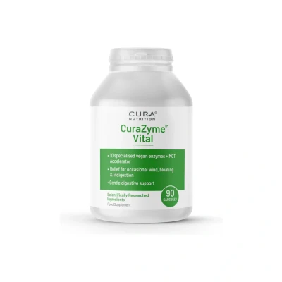 Healthy digestion is key to a properly functioning immune system, maximising energy levels and enhancing nutrient uptake from food. Many people do not produce enough enzymes to fully digest the foods they eat. Age, stress, digestive disorders and certain medications can all interfere with the body’s own enzyme production, making digestion more difficult. CuraZyme™ Vital is a specialised blend of 10 pharmaceutical-grade digestive enzymes utilising MCT as an accelerator. Alongside the key CuraBlend ingredients, the MCT accelerator not only helps this gentle enzyme formula significantly speed up, but it also increases the potency of the digestive enzymes. Created to jump-start digestion in the upper stomach, CuraZyme Vital works synergistically with the body’s own enzymes to help ensure nutrient availability. Supplementing each meal with a CuraZyme capsule can make all the difference to your digestive health.