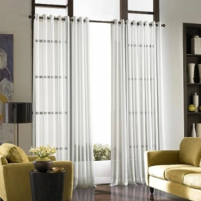 SHEER CURTAINS Create an airy appearance at your window with this thin, sheer grommet panel. The sheers are constructed of a fine, lightweight high twist voile fabric with a soft shimmer. Panel features 1.5-Inch dark gray grommets in a matte finish. Lightweight sheer grommet top curtain panels add a sophisticate look to your home; These beautiful unlined sheer curtains allow sunlight to gently filter into your room for a brighter look. LONG SHEER CURTAINS Soho Voile grommet window curtain panels are the perfect stylish accent for any home with a contemporary, transitional or traditional style decor; Long length curtains are perfect for high ceilings and drape gracefully around any window; These timeless and classic curtain panels are an easy solution to updating your formal or informal living area. LIVING ROOM CURTAINS Easily hang grommet curtains in your living room, dining room, home office, master bedroom or guest room; For proper fullness, fabric should measure 2 to 3 times the width of window frame (not width of window). Our light and airy sheers are quick and easy to hang; Use multiple panels to cover wider windows or add fullness. SHEER GROMMET PANEL Solid color sheer window panels can be used as a standalone treatment or layered window treatment; Grommet top allows you to easily open and close your curtains. MACHINE WASHABLE CURTAINS Includes 1 curtain panel; Available in Silver, Oyster (soft cream white beige) or Winter White. The Soho Voile grommet window curtain panels measure 63 inches long, 84 inches long, 95 inches long, 108 inches long, 120 inches long, 132 inches long or 144 inches long; Sheers curtain panel is constructed of 100% polyester.