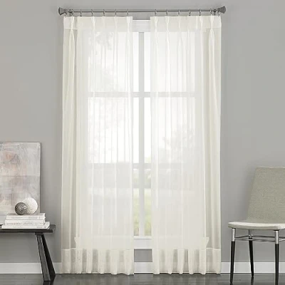 SHEER CURTAIN Sheer voile curtain panel with 8-Inch rolled hem INCLUDES 1 curtain panel STYLING OPTIONS Single panel is 29 inches wide; Pinch pleat construction with 4-inch Hidden back tabs; Hang pinch pleat sheer curtains in your home office, family room, living room, dining room or bedroom; Unlined. MEASURING INSTRUCTIONS For proper fullness, fabric should measure 2 to 3 times the width of your window frame (not the width of the window). EASY CARE: Machine washable; Panel is sold individually. Purchase multiple curtain panels to cover wider windows.