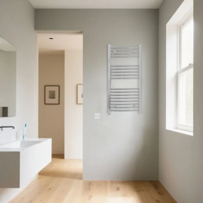 General description Manual electric bathroom towel radiator with a stylish curved design, perfect for keeping your towels warm and dry. This model features a durable high-quality chrome finish and is pre-filled and ready to install. Technical specifications Dimensions: 900x450mm Power: 300W Number of bars: 17 (4+5+8) Pipe center: 400mm Pipe diameter: 22mm Other information Fixing pack included complete with plugs and vents 10-year guarantee on radiator (applies only to water leaks) 2-year guarantee on electric element Manufactured to BS EN 442 We suggest you ask a qualified plumber/electrician to install this item