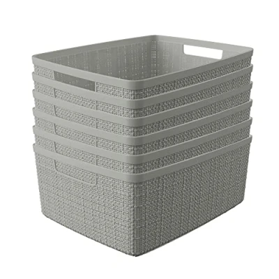 Curver Jute Decorative Plastic Organization and Storage Basket Perfect Bins for Home Office, Closet Shelves, Kitchen Pantry All Bedroom Essentials, (Set of 6), Grey, Medium