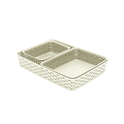 Curver My Style Rattan Effect Set of 3 Office Rectangular A4 A5 A6 Desk Storage Basket Tray Off White