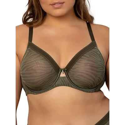 Curvy Couture Women's Sheer Mesh Full Coverage Unlined Underwire Bra, Olive Waves, 42E