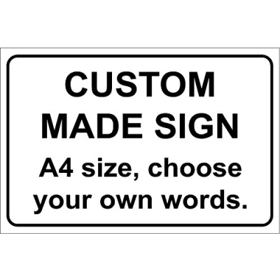Custom made Plastic Sign 1.2mm rigid plastic 300mm x 200mm When purchasing please message with custom text for sign. Digitally printed and laminated for extra durabillity