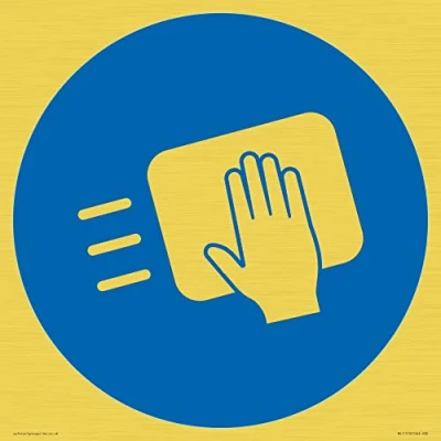 M915 : Disinfect surfaces This sign is made from vinyl gold sticker Gold metal effect sticker for flat, clean surfaces. Not for rough, plastic, or dusty surfaces. S30 square Sign Text: