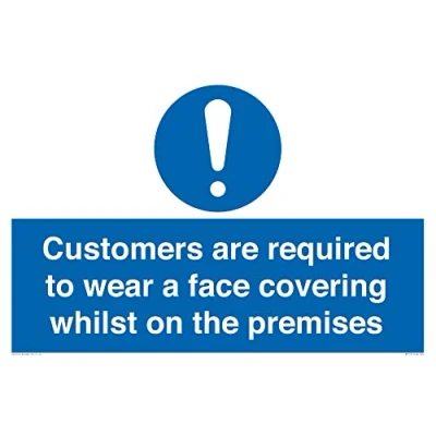 M001 : General mandatory action This sign is made from vinyl / sticker Air Release vinyl makes it easy to stick to flat, clean surfaces without bubbles. Not for rough, plastic or dusty surfaces. A2 landscape Sign Text: Customers are required to wear a face covering whilst on the premises