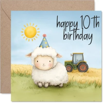 Packed with cheerful farm vibes, this card stars a lovable sheep in a party hat, bringing instant smiles to the big 10th birthday celebration Features a sunny tractor and classic farm setting in gentle pastel colours, making it a delightful pick for anyone smitten with countryside charm Printed on quality gloss single sided board with an uncoated inside-no smudging when writing inside and made from FSC-certified materials. Printed on 360 micron stock for a confident, premium feel Blank inside for your own personal message, plus comes with a matching envelope for easy gifting. The 145mm Square format is convenient to display or post Printed right here in the UK on recyclable -crafted to make their day a little brighter and your conscience a little lighter