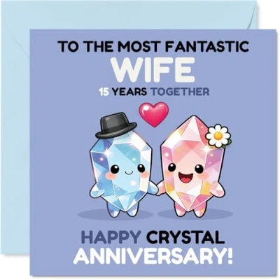 Captures the joy of 15 years together with two beaming cartoon crystals, radiating affection and a sense of shared adventure. Anniversary card for Wife with a light-hearted design style Playful crystal motif in cheerful blues and pinks brings a fun twist to the traditional anniversary theme-ideal for couples who love a touch of whimsy Printed on quality gloss single sided board with an uncoated inside-no smudging when writing inside, so your message will look as lovely as it sounds Inside message: Wife. Comes complete with a matching envelope for a polished finish. The 145mm Square format is convenient to display or post Lovingly made in the UK using recyclable, FSC-certified -designed to delight and crafted for keeps. Printed in the UK. A thoughtful choice that helps you send smiles and warm wishes