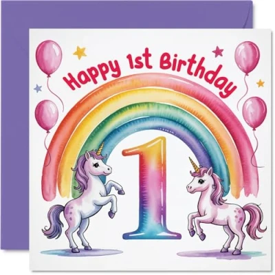 Cute 1st Birthday Card Bursting with Magic Unicorns, Rainbows and Balloons Pop Colour Sure to Delight Little Ones 145mm Square, Envelope Included
