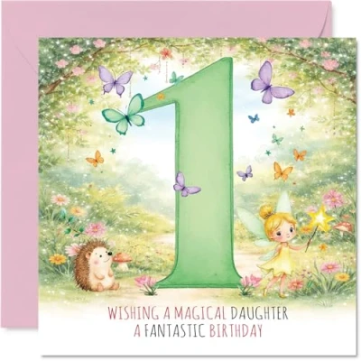 Packed with birthday magic, this card features an adorable fairy and hedgehog duo by a big green number one, surrounded by fluttering butterflies - guaranteed to make her smile A sweet, pastel design with enchanting woodland touches and pretty shades of green and pink, perfect for celebrating a little one's milestone birthday Crafted from gloss single sided board, with an uncoated inside for easy writing. No smudging when writing inside. Made in the UK using FSC certified materials and fully recyclable Blank inside, so you've got plenty of space for your own special birthday wishes. Comes complete with envelope for easy gifting. The 145mm Square format is convenient to display or post Designed to delight and made with care, this vibrant card adds a joyful touch to her big day - just the thing to mark a truly magical moment
