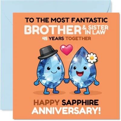 Full of charm, this card features two cheerful gem characters holding hands, capturing the fun and warmth of 45 years together. Anniversary card for Brother & Sister In Law with a light-hearted design style Bright orange, blue, pink, and white accents create a lively cartoon scene, making it a standout for a sapphire anniversary. Recyclable and printed in UK for a considerate choice Printed on glossy single-sided board with an uncoated inside for effortless writing. No smudging when writing inside. Printed on 360 micron stock for a confident, premium feel Inside message: Brother & Sister In Law. Includes a matching envelope for an easy and thoughtful gift. The 145mm Square format is convenient to display or post Designed and printed in the UK using recyclable materials and FSC-certified - a card you can feel good about giving. A thoughtful choice that helps you send smiles and warm wishes
