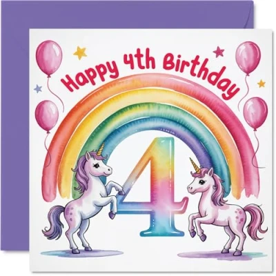 Cute 4th Birthday Card Magical Wishes Pastel Unicorn, Rainbow and Balloons Whimsical Charm for Their Special Day 145mm Square, Envelope Included