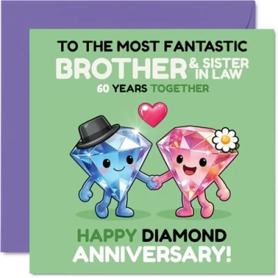 Celebrates a sparkling 60th with two charming diamond characters holding hands, capturing the joy and fun of a diamond anniversary. Anniversary card for Brother & Sister In Law with a light-hearted design style Features a playful design with colourful green, pink, and blue hues, plus a cheerful 'HAPPY DIAMOND ANNIVERSARY!' greeting on the front. Recyclable and printed in UK for a considerate choice Printed on quality gloss single sided board with an uncoated inside. No smudging when writing inside, making your heartfelt words shine. Printed on 360 micron stock for a confident, premium feel Inside message: Brother & Sister In Law. Includes a matching envelope to complete your thoughtful gesture. The 145mm Square format is convenient to display or post Proudly made in the UK using FSC-certified, recyclable -crafted to bring a smile and care for the planet. Printed in the UK. A thoughtful choice that helps you send smiles and warm wishes