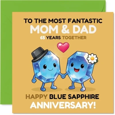 This charming card captures the joy of 65 years together, with two cute gem characters holding hands and sharing a big smile on the cover. Anniversary card for Mum & Dad with a light-hearted design style Playful blue. yellow, and green colours create a bright. eye-catching motif. making this a memorable keepsake for a blue sapphire anniversary Printed on quality gloss single sided board with an uncoated inside - no smudging when writing inside. Made with FSC certified board and fully recyclable Inside message: Mum & Dad. Comes complete with a matching envelope for easy gifting. The 145mm Square format is convenient to display or post Designed and printed in the UK with care, this card adds a special touch to a momentous celebration. A thoughtful choice that helps you send smiles and warm wishes