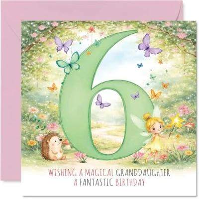 Full of birthday sparkle, this soft pastel design features a cheerful fairy and her hedgehog friend wishing a magical sixth birthday. Birthday card for Granddaughter with a light-hearted design style Whimsical number 6 motif is surrounded by fluttering butterflies and pretty flowers, making it extra special for little ones who love fairy tales Printed in the UK on recyclable, FSC-certified gloss board with an uncoated inside. No smudging when writing inside. Printed on 360 micron stock for a confident, premium feel Blank inside for your personal message. White envelope included for easy gifting. The 145mm Square format is convenient to display or post Created with care for a keepsake feel-sure to be treasured by your granddaughter long after her big day. Printed in the UK. A thoughtful choice that helps you send smiles and warm wishes