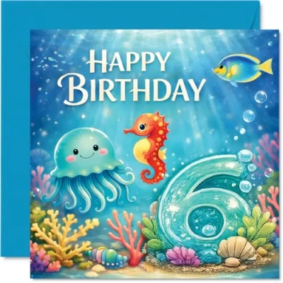 Cute 6th Birthday Card Splashes of Underwater Fun Cheerful Sea Creatures and Colourful Corals Bursting with Joy 145mm Square, Envelope Included