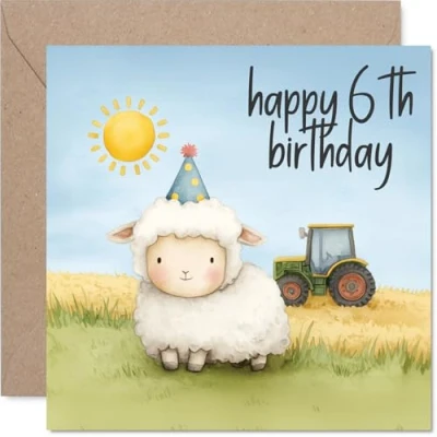 Cute 6th Birthday Card Sunshine and Smiles Party Sheep on A Tractor with Sunny Farm Backdrop Cheerful Pick for Animal Lovers 145mm Square, Envelope Included