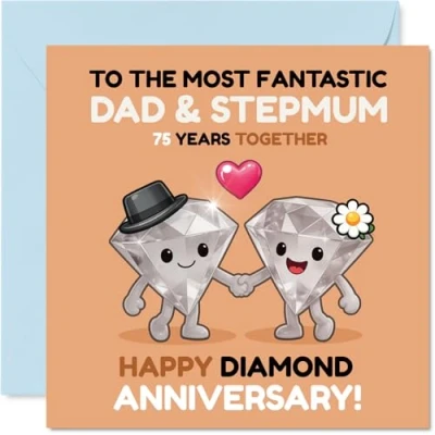 Full of charm and warmth. this card features two adorable diamond characters holding hands. perfect for marking such a huge milestone together Vibrant orange and pink hues combined with sweet diamond artwork give this design a playful, loving twist that stands out on the mantelpiece Printed on gloss single sided board with an uncoated inside - no smudging when writing inside and made using responsibly sourced FSC materials Inside message: Stepmum & Dad. Includes a quality envelope to make gifting simple and special. The 145mm Square format is convenient to display or post Expertly made in the UK, recyclable, and designed to add a smile for a truly memorable diamond anniversary. Printed in the UK. A thoughtful choice that helps you send smiles and warm wishes
