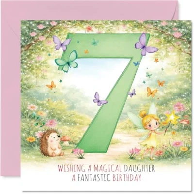 Sprinkled with charm, this card features a cheerful fairy and her hedgehog friend surrounded by vibrant flowers-guaranteed to make her feel extra special Playful fairy motif and colourful woodland backdrop put the spotlight on turning seven, giving the card a joyful, storybook feel she'll love Printed on gloss single sided board with an uncoated inside for easy writing. No smudging when writing inside, so your personal message stays neat Blank inside for your own magical birthday wishes. Each card comes with a matching envelope for that perfect finishing touch. The 145mm Square format is convenient to display or post Designed and printed in the UK using FSC-certified. Fully recyclable and made with care, so you can feel good about your choice. A thoughtful choice that helps you send smiles and warm wishes