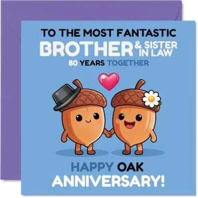 Brimming with charm, this sweet card captures the joy of 80 years together with two smiling acorns holding hands - a delightful nod to lasting love Features a whimsical acorn couple illustration on a cheerful blue and pink background, perfect for marking a special oak anniversary in a memorable way Printed on glossy single-sided board with an uncoated inside for easy writing. No smudging when writing inside - your message stays crisp and clear Inside message: Brother & Sister In Law. Arrives complete with a quality envelope for a polished finishing touch. The 145mm Square format is convenient to display or post Proudly made in the UK with FSC-certified, recyclable, so you can feel good about sending your heartfelt wishes. Printed in the UK. A thoughtful choice that helps you send smiles and warm wishes