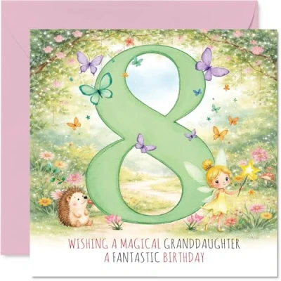 A delightful splash of fairy-tale fun, with a magical fairy and friendly hedgehog dancing around the big number 8, makes her birthday feel extra special Charming design features pastel shades of green and pink, butterflies fluttering, and an enchanting fairy scene - perfect for little dreamers who love magic Printed in the UK on recyclable, FSC-certified board; the uncoated inside means no smudging when writing inside your message. Printed on 360 micron stock for a confident, premium feel Blank inside so you can write your own personal birthday wishes; comes with a matching envelope to make gifting easy. The 145mm Square format is convenient to display or post Created with care for quality and cheer - a joyful way to brighten any young girl's big day and keep as a treasured memory. Printed in the UK