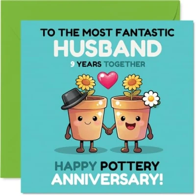 Bursting with charm. this card features two cheerful plant pots holding hands. complete with colourful flowers - a playful way to mark nine years together Delightful pottery-themed artwork pops with blue, yellow, pink and green, making it a standout choice for a special anniversary. Recyclable and printed in UK for a considerate choice Printed on quality gloss single sided board with an uncoated inside for effortless writing. No smudging when writing inside. Printed on 360 micron stock for a confident, premium feel Inside message: Husband. Includes a matching envelope to make gifting easy. The 145mm Square format is convenient to display or post. Envelope included Lovingly made in the UK using recyclable materials and FSC-certified - a thoughtful card you can feel good about giving. Printed in the UK. A thoughtful choice that helps you send smiles and warm wishes