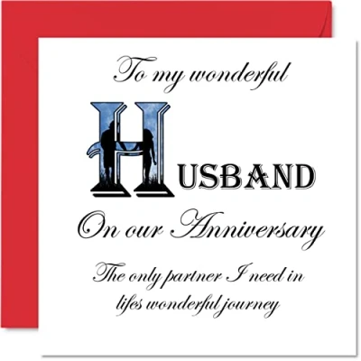 MAKE THEM SMILE WITH THIS HEARTFELT ANNIVERSARY CARD: This exceptional quality anniversary card for her or him shows the design "To my wonderful Wife on our anniversary the only partner i need in lifes wonderful journey". If you are looking for funny anniversary cards for men, then then this happy anniversary card is bound to make them laugh. Not just for relationship gifts for women this could also be for Husband, Wife, Boyfriend, Girlfriend, Partner or Companion. WHAT DO YOU GET: The card is printed on one side and BLANK ON THE INSIDE to allow you to write your very own message. The unique fun design is printed on a specially sourced and environmentally responsible board. At 360 microns thick the natural white one-sided gloss board has a quality look and feel. Supplied with a coloured gummed envelope to complement the design and ready to be sealed and sent in the post. Wife anniversary card, Boyfriend anniversary card. NO INK SMUDGES: There is nothing worse than writing inside a card to find that the shiny surface makes the ink smudge. This is why we use a high quality one sided coated board. The uncoated side will absorb more of the ink from your pen to make smudging a thing of the past. Anniversary card Wife, anniversary card funny, anniversary card husband. SIZES: Greeting Card = 145mm x 145mm, Envelope = 155mm x 155mm, Card Thickness = 360 micron. Great Wife anniversary cards from Husband, boyfriend or girlfriend anniversary card. Husband anniversary card from wife, anniversary cards for Boyfriend. MADE AND QUALITY CHECKED IN THE UK: We print and manufacture all our product right her in the UK so you can be sure of a fast turnaround and a product that is expertly made. Using environmentally responsible premium board our card is conscious of the responsible management of the world's forests - anniversary cards for Husband, anniversary cards for Wife, funny anniversary cards for her, anniversary card for boyfriend.